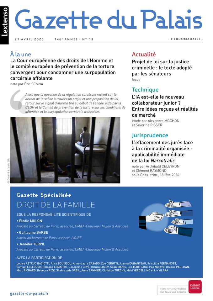 • Un panorama enrichi de l’actualité de la profession • Des analyses juridiques réactives de professionnels renommés • Un dossier « gazette spécialisée » pour suivre l’état du droit et la jurisprudence dans 13 domaines majeurs : Droit des entreprises en difficulté (4 RDV/an) - Droit de la famille (4 RDV/an) - Droit des sociétés (4 RDV/an) - Droit du travail et de la protection sociale (4 RDV/an) - Droit immobilier (4 RDV/an) - Droit pénal et procédure pénale (4 RDV/an) - Procédure civile (4 RDV/an) - Droit bancaire (3 RDV/an) - Droit des assurances (3 RDV/an) - Droit des baux commerciaux (3 RDV/an) - Droit du dommage corporel (3 RDV/an) - Droit privé du patrimoine (3 RDV/an) - Droit fiscal (1 RDV/an)