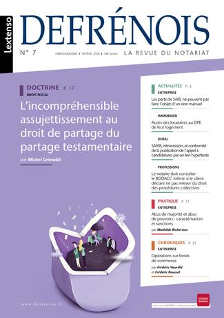 Chaque semaine (depuis le lancement de la nouvelle formule Hebdo le 7 septembre 2017), le Defrénois décrypte pour les professionnels du notariat les dernières évolutions législatives et jurisprudentielles dans tous leurs grands domaines d’expertise : ACTES COURANTS/IMMOBILIER - FAMILLE/PATRIMOINE - ENTREPRISE - FISCAL - PROFESSION - RURAL. À la fois revue d’information et revue scientifique de réflexion et d’imagination, le Defrénois a été repensé pour simplifier leur quotidien : appliquer de nouvelles règles et adopter de nouvelles pratiques dans de nouveaux contextes sociétaux.