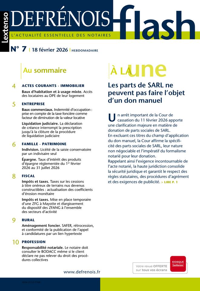 Complément indispensable du Defrénois, le flash offre chaque semaine aux professionnels du notariat et aux praticiens proches de cet univers un accès direct aux informations prioritaires qu’ils doivent maîtriser dans leur exercice quotidien. Mise en perspective et « contextualisée », l’actualité essentielle est dans le flash.