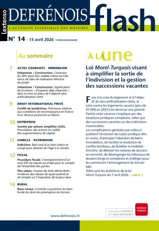 Complément indispensable du Defrénois, le flash offre chaque semaine aux professionnels du notariat et aux praticiens proches de cet univers un accès direct aux informations prioritaires qu’ils doivent maîtriser dans leur exercice quotidien. Mise en perspective et « contextualisée », l’actualité essentielle est dans le flash.
